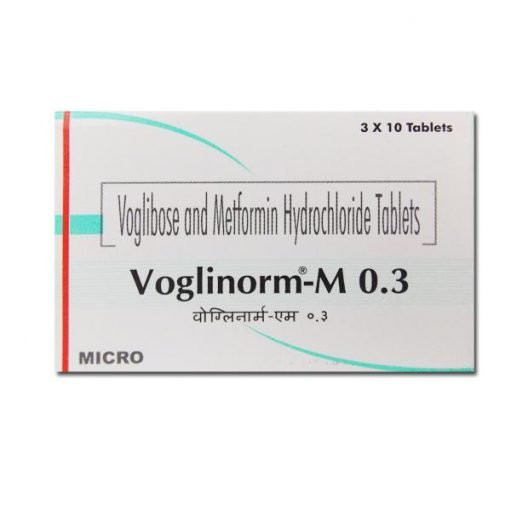 Voglinorm M 0.3 Tab is a combination medication containing Voglibose and Metformin, formulated for the effective management of type 2 diabetes mellitus. Voglibose, an alpha-glucosidase inhibitor, works by delaying the breakdown and absorption of carbohydrates in the small intestine, thereby significantly reducing the rise in blood glucose levels that occurs after meals (post-prandial hyperglycemia). This action helps to flatten the post-meal glucose curve and improve overall glycemic control.