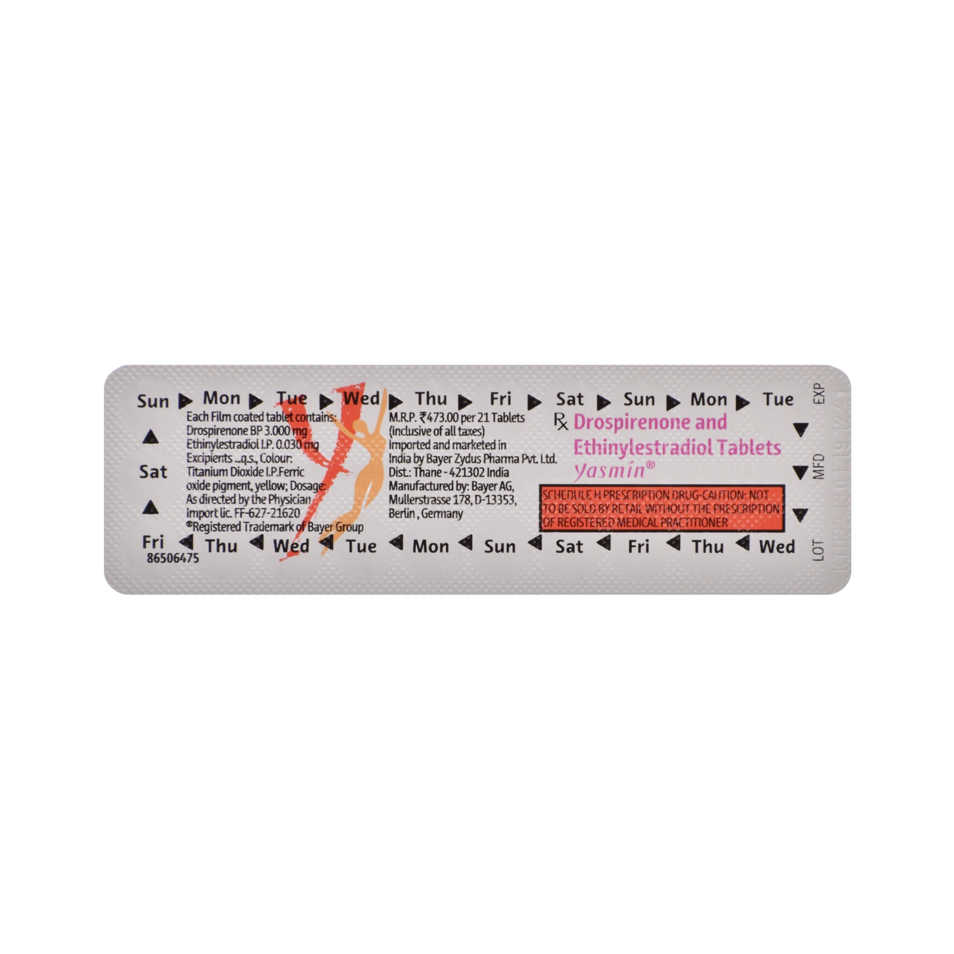 YASMIN TAB is a combined oral contraceptive pill containing drospirenone, a progestin, and ethinylestradiol, an estrogen. This formulation is designed to prevent pregnancy primarily by inhibiting ovulation, altering cervical mucus to impede sperm passage, and changing the uterine lining to prevent implantation. Drospirenone is unique among progestins due to its anti-mineralocorticoid and anti-androgenic properties, which can help reduce water retention, bloating, and androgen-related symptoms like acne. This makes Yasmin a popular choice for women seeking both effective contraception and potential benefits for premenstrual symptoms or mild acne. It is a monophasic pill, meaning each active tablet contains the same dose of hormones, simplifying its use and providing consistent hormonal levels throughout the cycle.