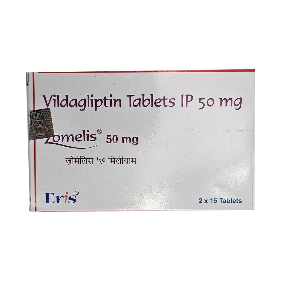 Zomelis 50 mg contains Vildagliptin, a potent and selective dipeptidyl peptidase-4 (DPP-4) inhibitor, used for the treatment of type 2 diabetes mellitus. Vildagliptin works by preventing the breakdown of incretin hormones, glucagon-like peptide-1 (GLP-1) and glucose-dependent insulinotropic polypeptide (GIP). By increasing the circulating levels of these active incretins, Vildagliptin enhances the sensitivity of pancreatic beta cells to glucose, leading to increased insulin secretion, and reduces glucagon secretion from pancreatic alpha cells. This glucose-dependent mechanism helps to lower both fasting and post-meal blood glucose concentrations without a high risk of hypoglycemia when used as monotherapy. It is effective as a standalone treatment or in combination with other antidiabetic agents.